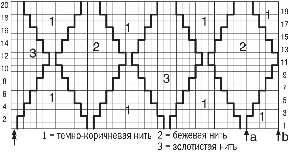 Узор из ромбов: вязать по приведенной схеме, каждый цветной участок — от отдельного клубка. Чтобы при смене цвета в вязаном полотне не образовывались отверстия, нити перекрещивать на изнаночной стороне работы. В высоту повторять с 1-го по 20-й ряд. Двойная стрелка на схеме = линия середины, стрелками А и В обозначено начало ряда для соотв. размера, распределение петель приведено в описании работы.