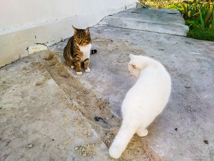 Бетонировал траншею. Кошки хорошо помогали, только отвернись...