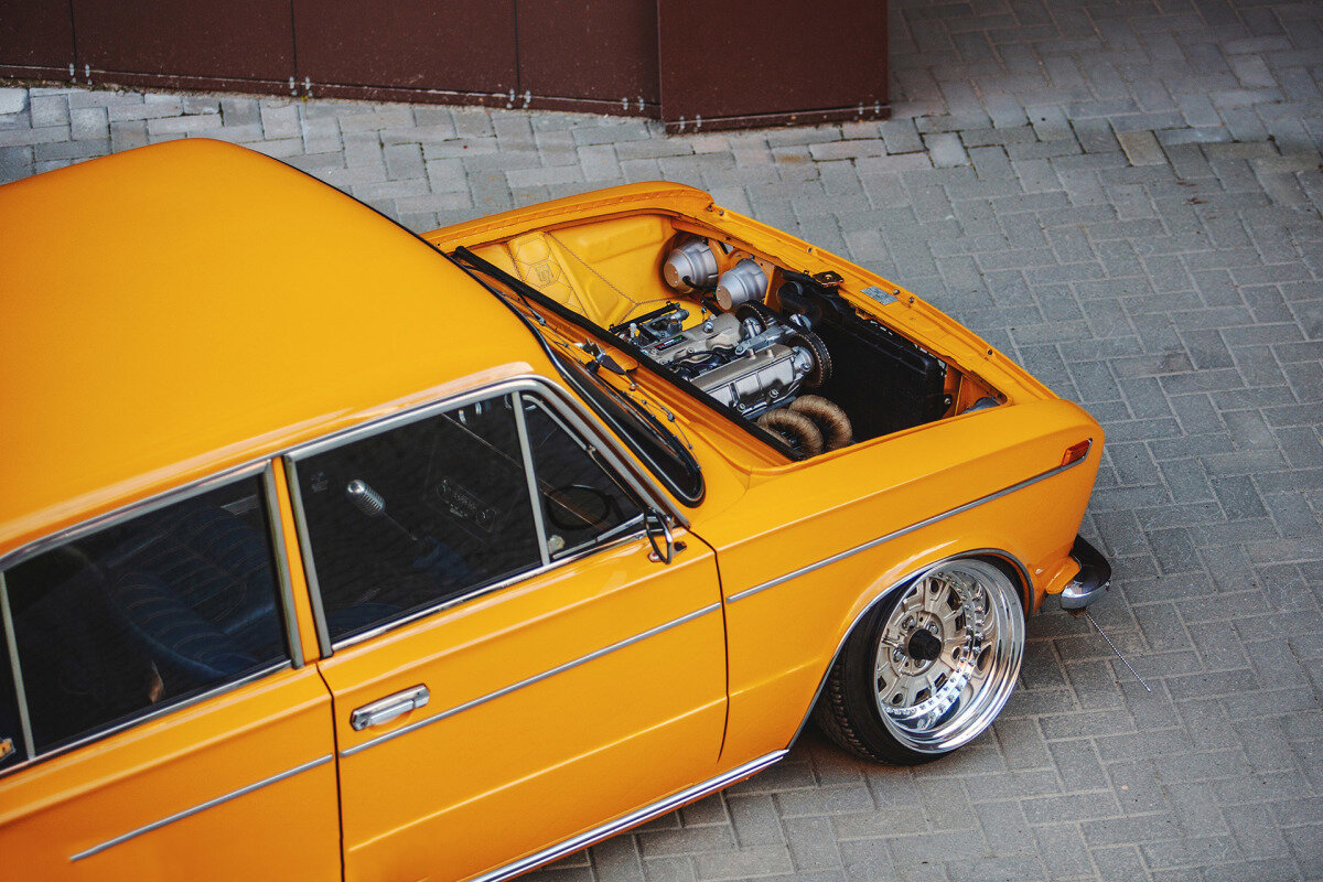 Когда я впервые увидел фотографии этой оранжевой Lada 2103 1981 года, я просто знал, что должен был увидеть ее лично. Днем владелец работает в автомобильной мастерской, где преимущественно обслуживает рулевые рейки. Его автомобильное хобби склоняется к работе, и хотя он не предлагает смешивать эти два занятия, есть плюсы, а именно полностью оборудованное оборудование помещение и много практических знаний, полученных на работе. Лада была куплена в 2014 году у знакомого. это была эмоциональная покупка. Ранее она была модифицирована и была известна в российских кругах, но проект требовал доработки, а значит, и низкой цены покупки. Хозяин знал, что он покупает 2103 для проекта, и это будет только машина выходного дня, но на старте он не знал, какой стиль модификации выбрать. Без многих хороших индивидуальных примеров этого шасси, в течение нескольких лет он был в недоумении для вдохновения. Но после просмотра множества классических проектов в Европе и США в Instagram и других социальных