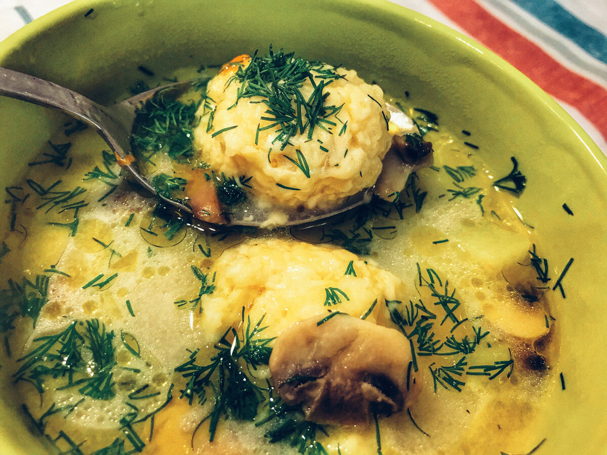 Очень ароматный, необычный и безумно вкусный суп. Ингредиенты: 👇 Способ приготовления: 👇 ✔️ Лук нарезаем мелко, жарим в кастрюле на растительном масле до золотистого цвета. ✔️ Морковь натираем на крупной тёрке, добавляем к луку и обжариваем 1 минуту. ✔️ Грибы чистим. Моем под проточной водой. Режем нарезаем как вам удобно. ✔️ Жарим до испарения жидкости, которую будут выделять грибы. ✔️ Нарезаем картофель кубиками и обжариваем вместе с грибами минуты 3. ✔️ Затем в кастрюлю наливаем воду, закрываем крышкой и доводим до кипения. Варим до готовности картофеля на среднем огне. ✔️ Приготовим сырные шарики пока варится картофель. В глубокой миске соединяем натертый на мелкую терку твердый сыр и яйцо. ✔️ Перемешиваем все, добавляем муку и замешиваем мягкое тесто. ✔️ Формируем из сырного теста шарики средней величины. ✔️ Опускаем сырные шарики в грибной бульон. Варим на маленьком огне минут на 10-15, пока тесто не сварится. ✔️ После в бульон добавляем 1 столовую ложку плавленого с