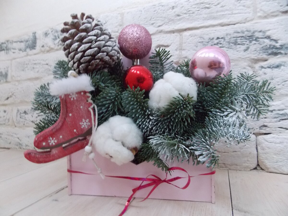 Вот такую зимнюю композицию можно сделать своими руками и украсить свой дом или подарить друзьям. Композиция выполнена в деревянном конверте. Его можно приобрести в специализированном магазине или сделать самим. На просторах интернета есть не мало МК по изготовлению таких конвертов из плотного картона, тоже будет не плохо. Для создания композиции вам нужно определиться с самой композицией: что и как там у вас будет. Когда сложится картинка, необходимо запастись материалами. У меня это ветки канадской ели нобилис, шишка и коробочки хлопка, которые я привезла из путешествия в Узбекистан, а также елочные игрушки. Для крепления веток и игрушек еще понадобятся кусочек пенопласта или можно купить флористическую губку, флористическая проволока, тейп лента, деревянные шпажки, зубочистки. Укладываете на дно конверта пенопласт. Готовите ветки и игрушки: игрушки крепите на флористическую проволоку при помощи термоклея, шишку и хлопок я зафиксировала на шпажке тейп лентой, ветку разбираем на более