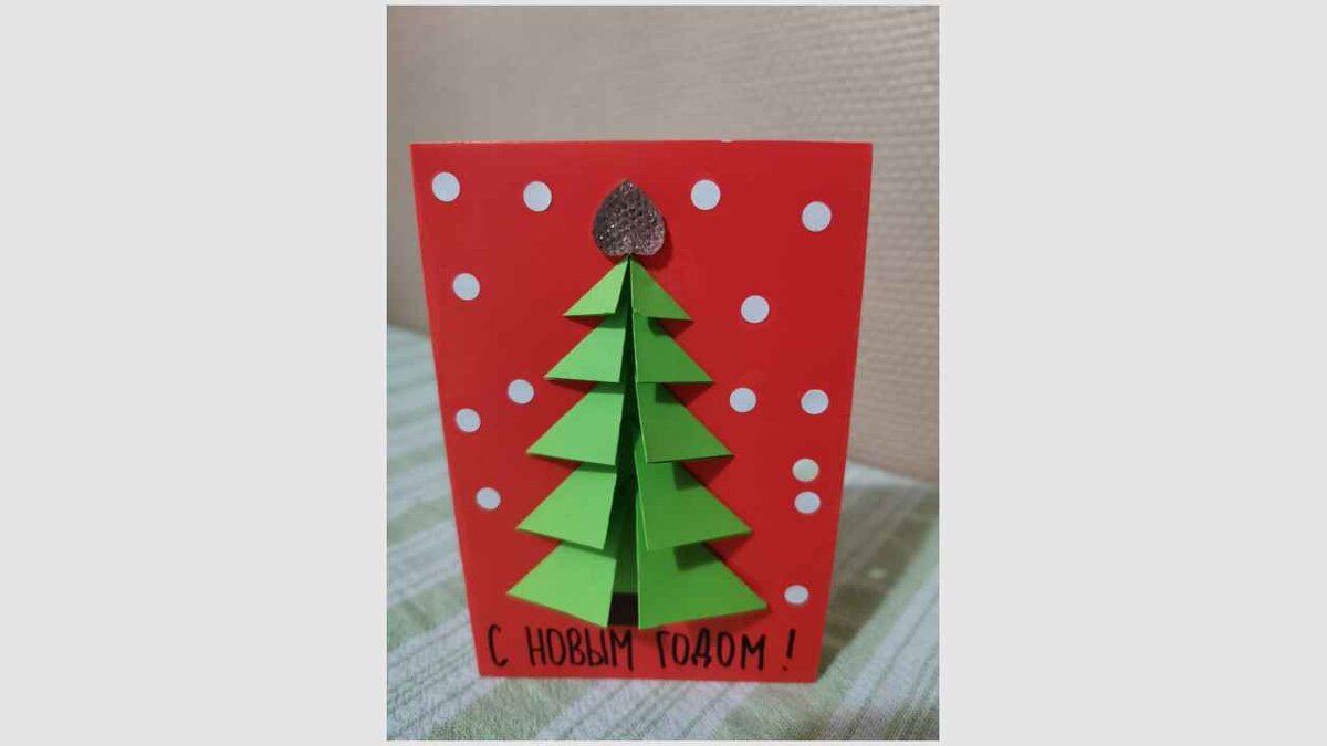 И у вас будет отличное дополнение к подарку на Новый год. Делаем вместе с ребёнком! Каждый лист картона А4 необходимо разрезать пополам и согнуть в открытки. У меня получилось 8 открыток по две каждого цвета. Цвета берите на свой вкус, я взяла праздничные. Декорировать край открыток декоративной лентой, стразами, бусинами или самоклеящейся цветной бумагой по желанию. Для ёлочки из бумаги Нарежьте двустороннюю зелёную бумагу на квадраты размером 7 х 7 см, 6 х 6 см, 5 х 5 см, 4 х 4 см и 3 х 3 см. Согните каждый квадрат пополам. Согните левый и правый край к центру в форме треугольника. Всего получилось 5 деталей для ёлочки. Можете сделать больше, насколько хватит вашей фантазии. В данном случае для открытки нашего формата такой ёлочки вполне достаточно. Приклейте крону на ПВА, начиная с верха, каждый последующий треугольник вставляя в предыдущий. К последнему треугольнику приклейте внутри ствол и потом приклейте к открытке. Декорируйте по желанию. Для ёлочки из пуговиц Выложите