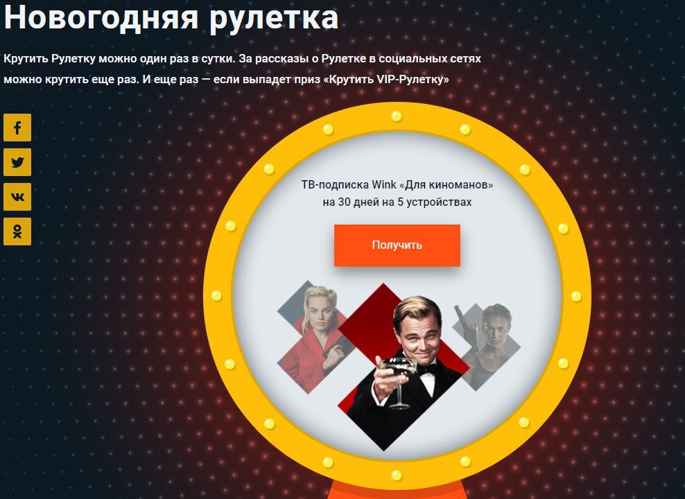 1. Заходим на сайт Sibnet 2. Крутим колесо и вам выпадет подписка Wink «Для киноманов». Теперь остаётся только нажать кнопку "Получить", подтверждаем номер и забираем приз)