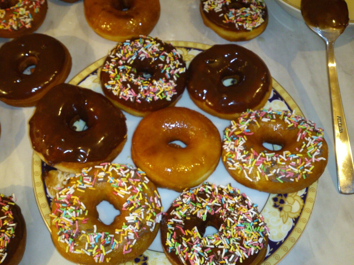 Из всей выпечки которую я готовлю, я больше люблю пончики! Для приготовления нам понадобиться: 1. Яйца 2шт. 2. Молоко 3,2% 250 мл. 3. Сливочное масло 90гр. 4. Дрожжи сухие 14гр. 5. Сахар 60 гр. 6. Ванилин (по вкусу). 7. Соль (щепотка). 8. Мука 650гр. 9. Растительное масло для жарки. Для украшения: 10. Шоколад, глазурь, сливки, посыпка. Приготовление: 1. Растопить масло, молоко подогреть ( молоко должно быть теплым). 2. Смешать яйца, масло, молоко, сахар, дрожжи, ванилин, соль. 3. Добавить просеянную муку частями и замесить мягкое тесто. 4. Поместить тесто в чашу и накрыть пищевой пленкой (или полотенцем). 5. Оставить на 1 час в теплом месте. 6. Раскатать тесто в пласт толщенной 1 см и вырезать нужного размера пончики. 7. Разогреть масло и жарить пончики на среднем огне чтоб они пропеклись и не сгорели. По желанию можно покрыть шоколадом либо глазурью. Приятного аппетита