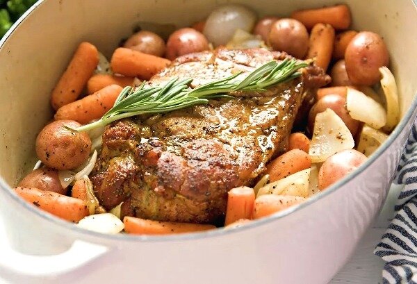 Рецепт жаркого из свинины с картошкой пригодится тем, кто хочет поставить на праздничный стол вкусное традиционное блюдо – богатое и простое одновременно. Можно приготовить жаркое из свинины с картошкой в казане в духовке, а можно – в мультиварке, как вам более удобно. Большой кусок обжаренной свинины с розмариновой веточкой на вершине, окруженный мягкой рассыпчатой картошкой и сладкой морковью… Мммм… Это очень вкусно, а смотрится супер эффектно! Этот рецепт очень прост, доступен по деньгам и восхитительно вкусный. Я советую класть в него побольше моркови, поскольку она дает сладость, а свинина удивительным образом сочетается со сладким вкусом. Это знают в китайской кухне – там соусы к мясу готовят почти всегда с сахаром. Касательно мяса – не бойтесь, что оно не прожарится в достаточной степени, приготовьте его одним крупным куском. Таким образом, вы получите по-настоящему сочную свинину. Начните готовку, покрыв кусок мяса маслом, а затем посыпав его специями. Обжарьте его в духовке в