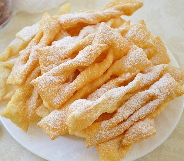 Безумно вкусный и легок в приготовлении хрустящий хворост. Нам понадобиться: 1. Яйцо 4шт. 2. Мука 3 стакана. 3. Водка 50 г. 4. Сахарная пудра 100 г. 5. Масло подсолнечное 500мл. Приготовление: 1. Взбить яйца с щепоткой соли, добавить водку. 2. Добавить муку и замесить тесто. 3. Раскатать тесто толщенной 2мм. 4. Нарезать тесто полосками 3-4 см. По середине сделать надрез. 5. Разогреваем масло и обжариваем наш хворост. 6. Посыпать сахарной пудрой. Можно подавать к столу. Приятного аппетита!