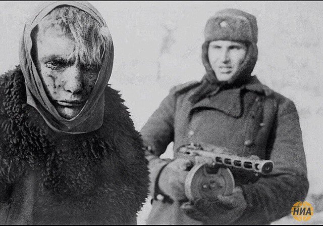 Правда, в жизни все было чуть-чуть по-другому. Колонны встречались нечасто, потому что сдавались в плен немцы в основном небольшими группами по всей огромной территории города и окрестностей, а во-вторых, никто их не конвоировал вообще. Просто им указывали направление, куда идти в плен, туда они и брели кто группами, а кто и в одиночку. Причина была проста — по дороге были устроены пункты обогрева, а точнее землянки, в которых горели печки, и пленным давали кипяток. В условиях 30-40 градусного мороза уйти в сторону или убежать было просто равносильно самоубийству. Вот никто немцев и не конвоировал, разве что для кинохроники..