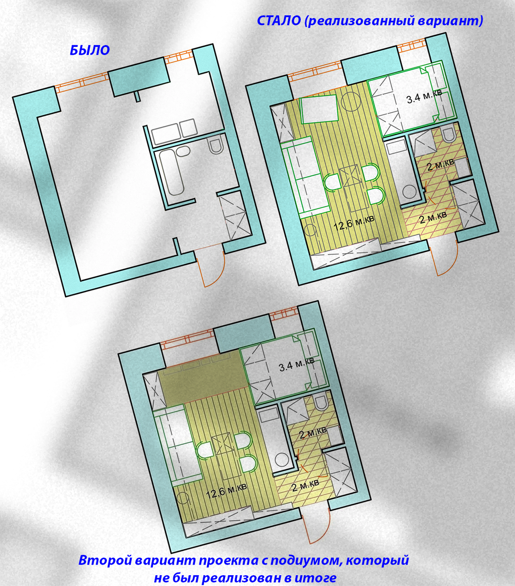 Как видно на плане, ванную комнату и прихожую уменьшили, в получившейся нише в жилой комнате расположили кухню, а на месте кухни сделали спальню с кровать на подиуме во всю ее ширину, под подиумом расположился небольшой холодильник, выдвижная вешалка-гардероб и ящики для хранения (кровать оснащена подъемным механизмом и подняв ее, можно получить к ящика доступ через небольшую дверцу слева).