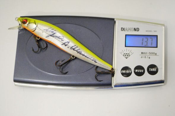Вес (заявленный на корпусе) – ½ oz = 14 грамм. Весы показывают более точный вес – 13,7 грамм. Предельно ясный в анимации воблер. Можно ловить им равномеркой, но раскрывается он именно при рывковой анимации: делае