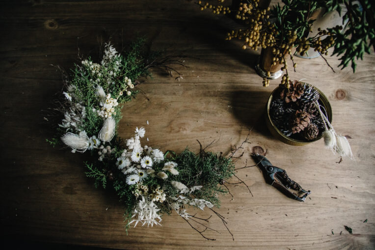 Если вы так и не придумали, как украсить свой дом, присмотритесь к венкам – они могут быть самостоятельным украшением или дополнять ваш новогодний декор в виде елок и гирлянд. Флорист Лиза Амбрасовская показываем, как сделать необычный новогодний венок своими руками. Мы уже рассказали вам, как создать классический зеленый венок, а теперь предлагаем включить фантазию и сделать необычную композицию. 1. Для не совсем классического рождественского венка Лиза взяла за основу композицию из веток в форме полукруга. Такую вы можете заказать у независимых магазинах, например у Local Flowers или Veter Flower Farm. 2. Приобретите разные виды сухоцветов, зеленых и белых, пушистых и колючих – вместе они будут отлично смотреться. 3. Сформируйте пучки из заготовленных веток и сухоцветов. 4. Садовой проволокой зеленого цвета начинайте прикреплять пучки к основе. 5. Создайте еще столько пучков, сколько потребуется для формирования пышного рисунка. 6. Главное – не делайте венок слишком однородным, чем