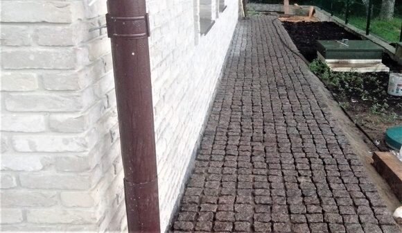 При бетонировании отмостки применяйте вибратор для уплотнения смеси, после того как бетон будет залит в опалубку отмостки, обязательно произведите разглаживание горизонтальной части отмостки. При последующей облицовке отмостки, ровная поверхность сохранит бюджет на лишний расход клея или сухой смеси. Уход за бетоном производить по стандартным условиям- укрыть мешковиной смоченной водой, или производить регулярный полив водой отмостки, что предотвратит ее от растрескивания бетонного молочка.