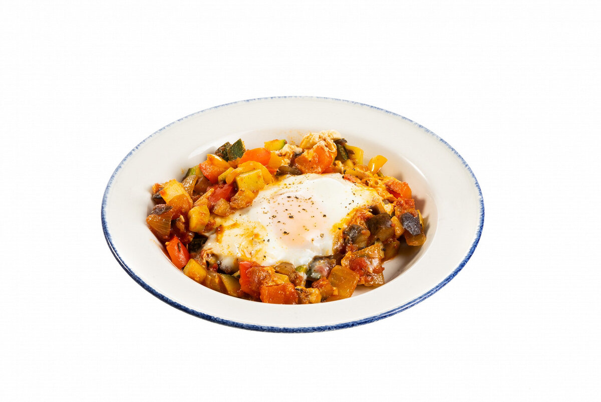 ИНГРЕДИЕНТЫ Цукини 2 штуки Баклажаны 1 штука Сладкий перец 3 штуки Лук репчатый 3 головки Консервированные помидоры кусочками 400 г Чеснок 3 зубчика Сушеный тимьян по вкусу Сушеный розмарин по вкусу Оливковое масло 90 мл Яйцо куриное 4 штуки Сахар по вкусу Соль по вкусу Перец черный молотый по вкусу ИНСТРУКЦИЯ ПРИГОТОВЛЕНИЯ Нарезать баклажан небольшими кубиками, выложить на бумажные полотенца, посолить и оставить на 10 минут.