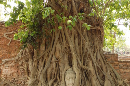 Символ древней столицы Тайланда ⚜️ На территории тайского храма Ват Махатхат в древней столице - в городе Аюттхая растёт необычное столетнее дерево, один вид которого производит завораживающее и даже гипнотическое воздействие. Исключительность дерева отнюдь не в возрасте. Дело в том, что среди его корней видна внушительных размеров каменная голова Будды. Когда - то в Аюттхае располагалась главная резиденция буддистов, но в 1767 году город был разрушен бирманцами. По преданию, завоеватели мечами отсекали головы у статуй Будды, а чтобы ещё больше унизить тайцев - закапывали головы в землю. Говорят, что сама природа воспротивилась такому положению вещей, и корни дерева, растущего на территории храма Ват Махатхат, подняли голову Будды на поверхность земли. .