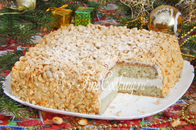 В основе этого замечательного торта - классический белый бисквит, пропитанный сахарным сиропом с коньяком. Начинкой послужит масляный крем Шарлотт, которым мы также покроем верх и бока торта. Украшение этого десерта более чем незамысловато: жареный арахис и совсем немного сахарной пудры. Все просто, легко и изумительно вкусно. Кстати, этот десерт очень похож на легендарный торт Сказка, поэтому любители подобной выпечки его точно оценят по достоинству.