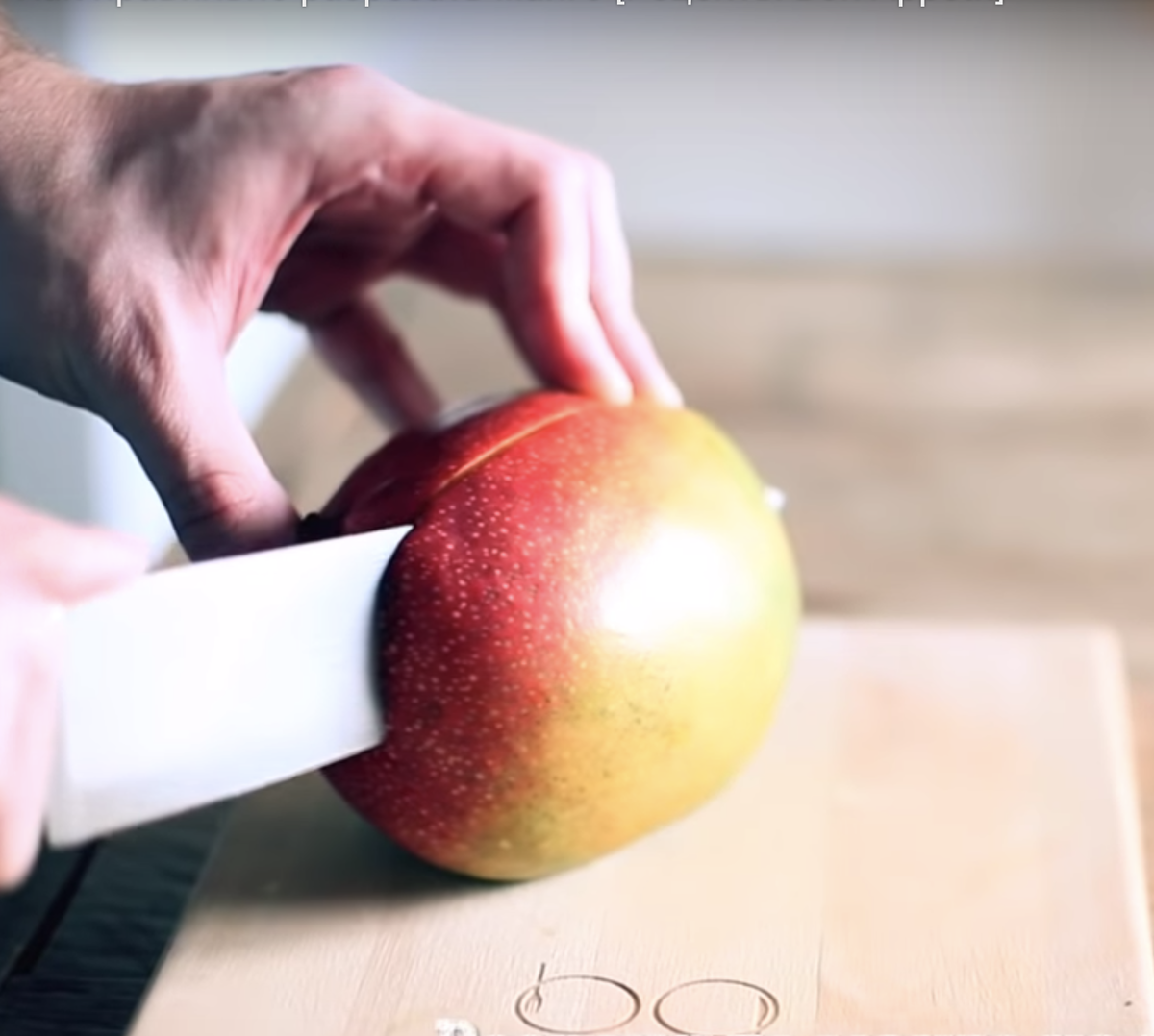 Все мы с вами когда то пробывали манго, кто-то на отдыхе, кто-то уже в нарезанном виде. Но иногда хочется покушать экзотический фрук дома, купив его в супермаркете. И многие начинают снимать кожуру и грызть его как яблоко при этом обгладывать косточку. Начинает вытекать много сока и капать на одежду и пол. Что выглядит очень не эстетично. Но есть выход просто нарезать его правильно и наслаждаться эстетичностью и вкусом экзотического фрукта. Для начала нужно разрезать манго на 3 части отрезая по бокам. Примерно оставить середку 1-2 сантиметра, это стандартный размер косточки которая занимает большую часть середины. Да фрукт довольно дорогой для обычного россиянина, но не надо жалеть середку, ее можно не выкидывать а оставить на потом. Далее две внешние части манго режем вдоль так же как на фото. Главное быть очень осторожным что бы не прорезать ножом тонкую кожуру и поранить руку. Будьте внимательны! Так же переворачиваем и нарезаем что бы получились кубики примерно 1*1 сантиметр