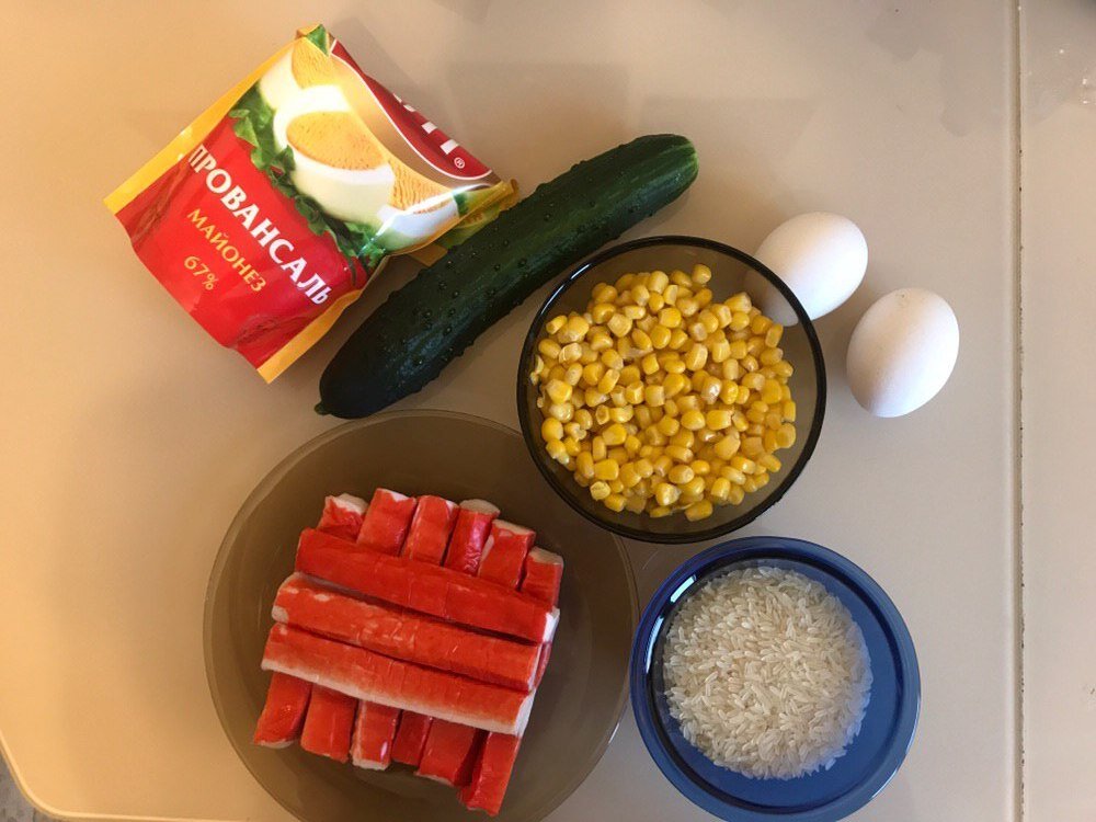 Ингредиенты: Способ приготовления: Отвариваем яйца вкрутую. 7 минут. Отвариваем рис в подсоленной воде как указано на упаковке. 20-25 минут в моем случае. Режем крабовые палочки и вареные яйца на кусочки примерно по 1 см. Режем огурец на кусочки примерно по 2 см. Рис остужаем, смешиваем все ингредиенты и заправляем майонезом по вкусу. Салат готов. Приятного аппетита! Оригинальный рецепт: https://glaved.ru/salat-s-krabovymi-palochkami-i-kukuruzoj/