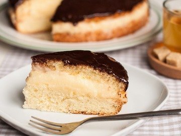 Бостонский кремовый торт — легкий и неимоверно воздушный десерт. Это торт является официальным десертом штата Массачусетс. Его придумал французский шеф-повар М. Sanzian. Ингредиенты: Мука - 125 г Яйцо - 4 шт. Сахар - 150 г Разрыхлитель - 1 ч.л. Лимонный сок - 1 ч.л. Растительное масло - 3 ст.л. Сливки - 50 мл Шоколад - 200 г Для крема: Молоко - 500 мл Яйцо - 2 шт. Сахар - 100 г Крахмал - 30 г Ваниль Сливочное масло - 50 г Приготовление: 1. Молоко вскипятить со стручком ванили. Яйца перемешать с сахаром и крахмалом. Аккуратно влить горячее молоко в яичную смесь, постоянно помешивая. 2. Перелить крем обратно в ковшик и поставить на средний огонь. Довести до кипения и прокипятить пару минут — постоянно мешать крем. Снять с огня и вмешать сливочное масло. 3. Охладить крем, накрыв пищевой пленкой. 4. В миску просеять муку, разрыхлитель и 50 г сахара. Отдельно смешать желтки, лимонный сок и растительное масло. Белки взбить с оставшимися 100 г сахара до мягких пиков. 5. Постепенно вмеш