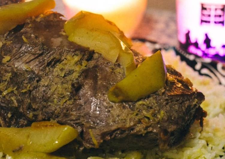 Ингредиенты Как приготовить Говядину натереть солью и черным перцем.⠀ Смешать мед, имбирь, цедру лимона и соевый соус.⠀ Смазать соусом говядину.Оставить мариноваться в тепле на 2-3 часа.⠀⠀ Яблоки почистить и порезать на 8 частей. Масло растопить.⠀⠀ В говядине сделать прорези больше, чем до середины. Заполнить прорези дольками яблок. Положить говодину в рукав для запекания и полить растопленным маслом.⠀ Запекать в духовке на 180° 2 часа. На гарнир подойдёт жаренный рис. Приятного аппетита 😉 источник