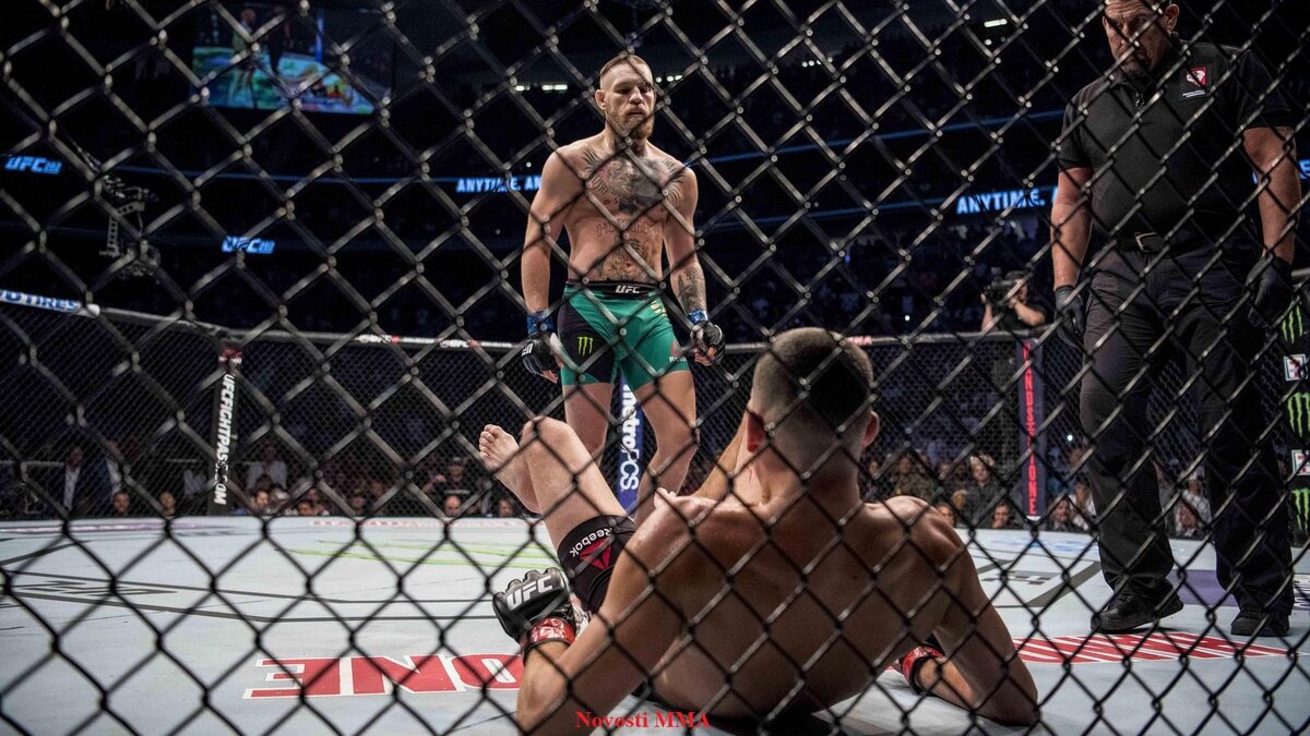 - За неделю до боя с Макгрегором Дос Сантос травмировался и на замену ему вышел Нейт Диаз.Нейт просто изнуряюще избил Конора и задушил его.