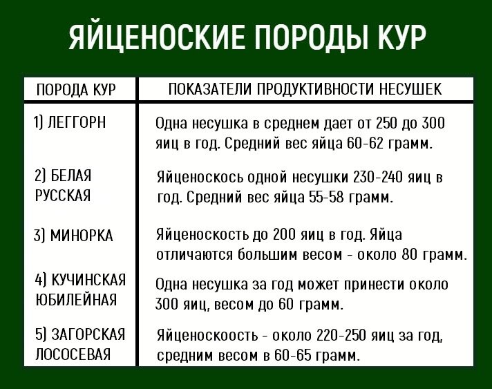 💚 Какие куры самые яйценоские? Куры дают яйца на протяжении всего своего продуктивного возраста, в среднем наиболее эффективны куры в течении 2-3 лет, далее яйценоскость падает. О том, сколько могут дать куры яиц, и какой вес в таблице 👇🏻