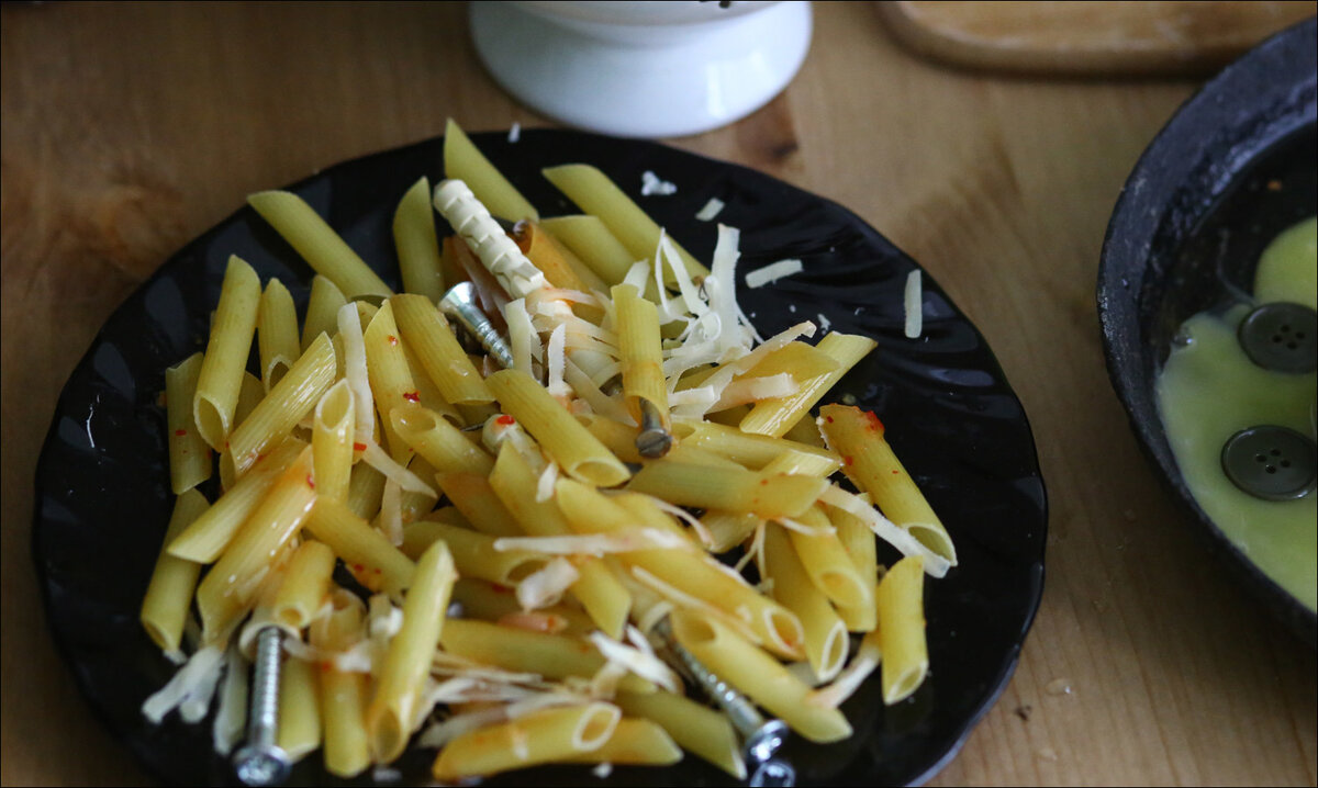 Сегодня в прошивке робота умного дома случился какой-то баг. Похоже, эта зараза забыла выйти из ночного цикла обучения и переобучила свою нейросеть распознавания образов. Собственно, это было сразу заметно по винтам, вставленным в макароны, как в дюбели. Только вчера мы вешали полку на кухне, и робот как раз искал в кладовке подходящие дюбели.