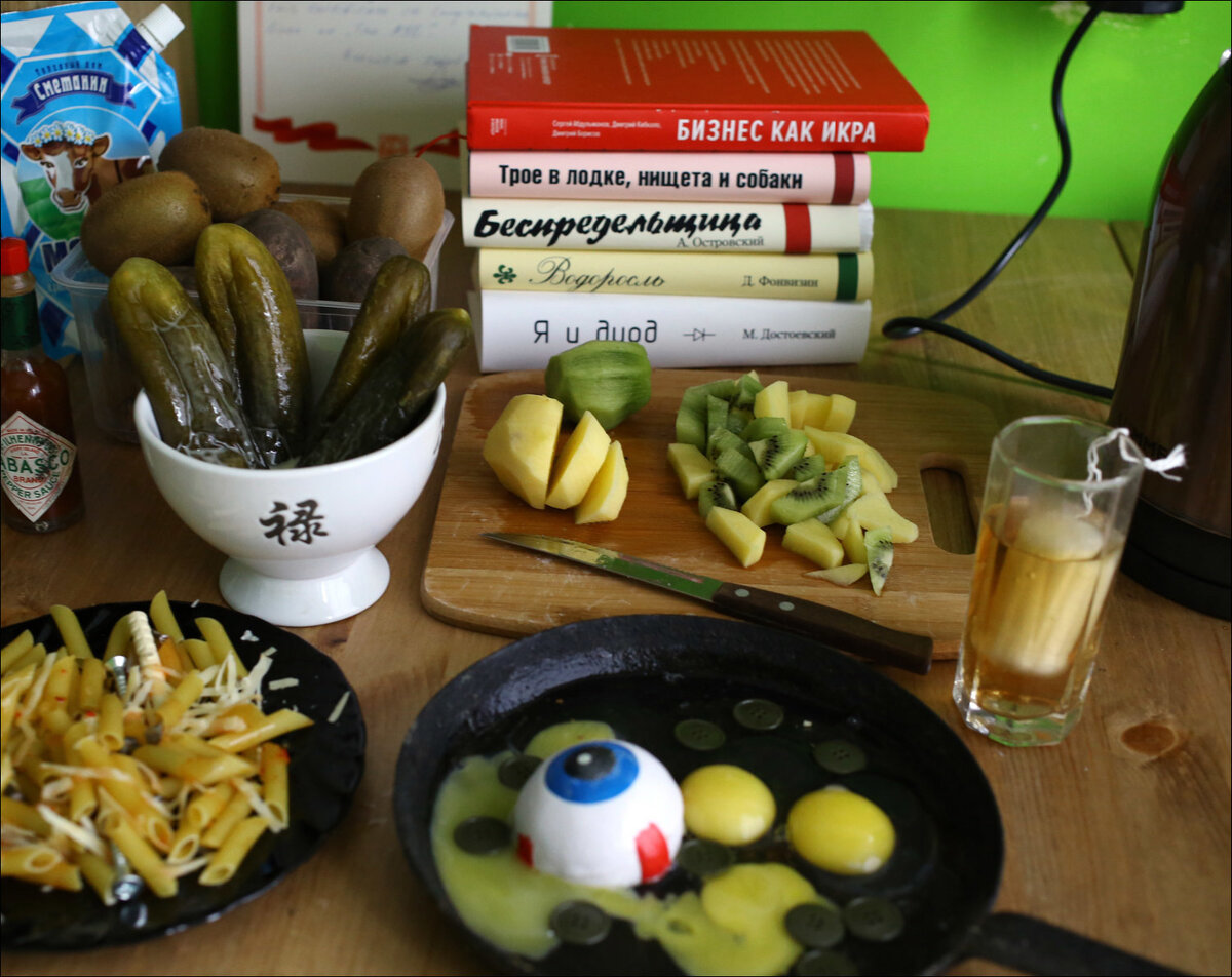 Дальше начались баги более высоких порядков. Нет, пуговицы в яичнице я могу понять — это просто ошибка нарезания солёного огурца. Или что-то подобное, уже не узнать. Такое регулярно случается. А вот сделать глазунью — это был хороший план. По крайней мере, я рад, что этот глаз не от соседа.