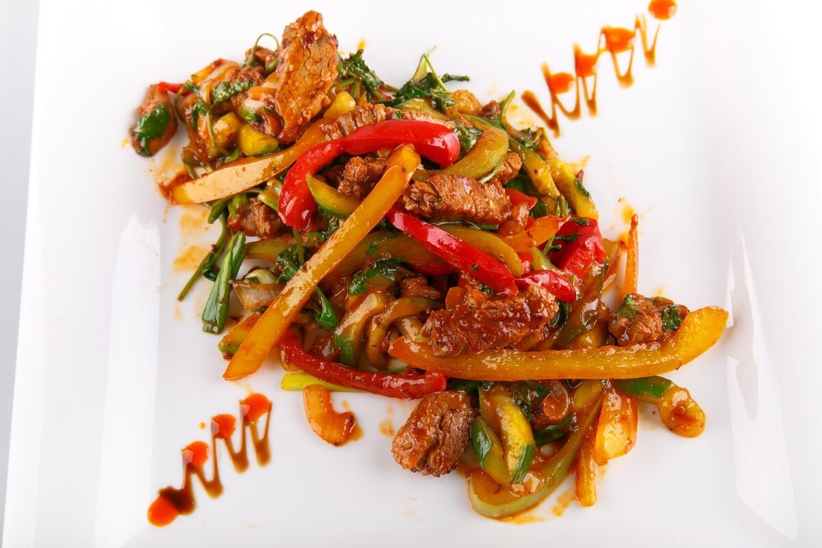 Нам понадобится: Способ приготовления: 1. Нарежьте говядину на брусочки и сразу же не раздумывая запанируйте их в картофельном крахмале. Соевый соус смешайте с медом, размешайте и залейте мяско, перемешайте. 2. В таком виде мясо должно постоять в холодильнике и замариноваться около 30 минут. Тем временем измельчите репчатый лук тоненькими полукольцами, а морковь нарежьте соломкой или брусочками. На сковороду налейте растительное масло и хорошо ее разогрейте, мясо выньте из холодильника, слейте маринад и обжарьте до золотистой корочки. Выньте все мясо из сковороды. 3. Болгарский перец тоже измельчите соломкой. Чеснок выдавите через чеснокодавилку. Теперь в то масло, на котором обжаривалось мясо внесите чеснок и обжарьте его 1 минуту в масле, после внесите измельченный лук, пока лук не станет мягеньким, можно подлить еще масла. После добавьте морковь и жарьте до мягкости. Теперь внесите перец болгарский и также обжарьте до готовности. Положите мясо, всыпьте все приправы, перец, молот