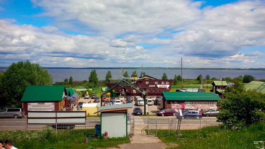 Территория музея находятся через дорогу от торгово-увеселительной площади. Вход на территорию платный - символические 30 рублей с человека. И вот от кассы начинается лестница в гору. За нами уже подоспели новобрачные с гостями, видимо приехали делать красивые фотографии. А фотографии здесь и впрямь красивые, только посмотрите какой открывается вид на озеро и развлекательную площадь возле него.
