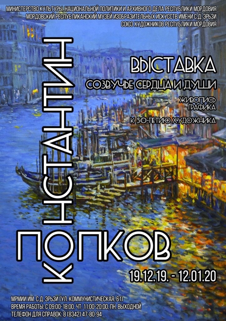 В зале временных композиций музея Эрьзи откроется выставка члена Союза художников России, живописца и графика Константина Попкова, которая будет приурочена к 50-летию автора. Это более 50 произведений в жанрах тематической картины, пейзажа, натюрморта, портрета в техниках акварели, гуаши и оригинального рисунка. Левитановские интонации, цветочные натюрморты и глубокие философски композиции. Время: 16:00 (четверг)