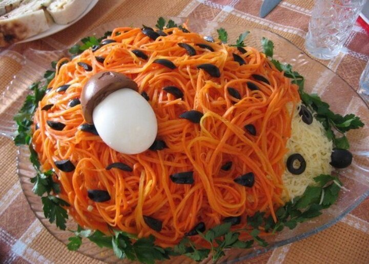 Дети будут в шоке от такого рецепта!!! Салат "ёжик." Ингредиенты: куриная грудка - 200-300 гр, грибы свежие или замороженные (желательно опята) - 300 гр, куриные яйца - 3 шт, твердый сыр - 250 гр, репчатый лук - 1 шт, корейская морковь - 400 гр, маслины - 2 шт (для украшения), майонез, растительное масло. Готовим: Куриную грудку отвариваем в соленой воде, остужаем и нарезаем кубиками. Грибы нарезаем и обжариваем на сковороде вместе с нарезанной головкой репчатого лука. Куриные яйца отвариваем и натираем на терке, сыр также натираем на терке. Салат выкладываем на плоское блюдо слоями в форме ёжика, каждый слой тщательно промазывая майонезом: 1 слой - куриное мясо, 2 слой - обжаренные с луком грибы, 3 слой - отварные яйца, 4 слой - корейская морковь. Так как блюдо детское, корейскую морковь можно заменить обычной морковью, отваренной и натертой на терке! Мордочку ёжика делаем из тертого сыра, глазки и носик - из маслин. Приятного аппетита! Надеюсь рецепт был полезен)