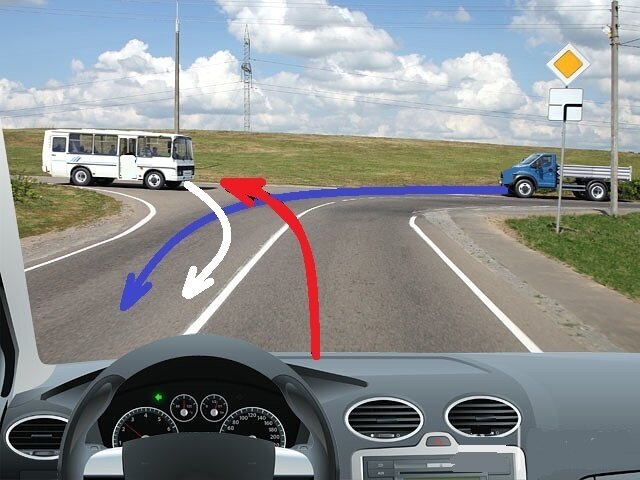 Здравствуйте-здравствуйте, дорогие автомобилисты, мотоциклисты, велосипедисты, пешеходы и не только! "Проезд перекрёстков" - пожалуй одна из самых любимых тем в автошколе и это очень хорошо, ведь знания проезда перекрёстков являются основными на дороге. Давайте сейчас решим задачку именно с этой темы и тем самым освежим свои знания. Задача: Кому вы уступите в показанной ситуации? Выберите правильный вариант: 1)Только грузовику 2)Только автобусу 3)Уступите обоим 4)Проедете первыми Ну что, вы уже определились со своим выбором? Надеюсь, это не отняло у вас много времени, ведь хорошие водители решают такие задачки, как говорится, на автомате. Надеюсь вы были внимательны и хорошо всё обдумали, а сейчас мы переходим к самой ситуации. А ситуация у нас следующая: на нерегулируемом перекрёстке встретились 3 транспортные средства: автобус, поворачивающий направо, грузовик, который едет налево и мы также поворачиваем налево. На нашем перекрёстки дороги неравнозначные, поскольку мы видим знаки при