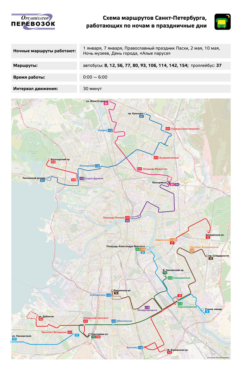 В дни круглосуточной работы метрополитена (за исключением ночи с 31 декабря 2019 года на 1 января 2020 года) с 0:00 до 06:00 осуществляется движение автобусов по маршрутам №№ 8, 12, 56, 77, 80, 93, 106, 114, 142, 154 и троллейбусов по маршруту № 37, обеспечивающим подвоз жителей спальных районов Санкт-Петербурга к станциям метрополитена. Интервал движения составляет 30 минут. Схема движения автобусов опубликована на сайте СПб ГКУ «Организатор перевозок».