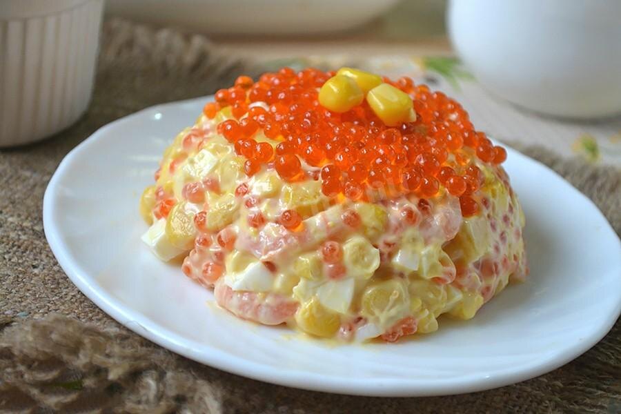 ИНГРЕДИЕНТЫ : Яйцо 1 шт Креветки 300 гр Кукуруза консервированная 150 гр Икра красная 60 гр Майонез 75 гр СПОСОБ ПРИГОТОВЛЕНИЯ: 1. Яйцо куриное отвариваем вкрутую, опускаем в холодную воду, затем очищаем и нарезаем кубиками. 2. Креветки отвариваем в подсоленном крутом кипятке примерно 5-8 минут, затем очищаем. 3. В миске смешиваем подготовленные: яйцо, креветки, консервированную кукурузу, красную икру. Добавляем майонез, перемешиваем. 4. Чтобы оформить салат, нужно взять салатник подходящего размера и формы, выстелить его пищевой пленкой, выложить в него салат, затем накрыть плоским блюдом и перевернуть салатник. Аккуратно отделяем пленку, украшаем красной икрой, а также зернами кукурузы - салат готов! Приятного аппетита!