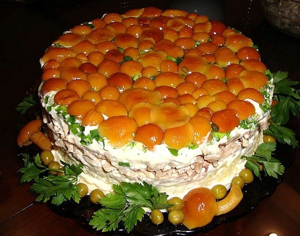 Ингредиенты: Грибы маринованные — 500 Грамм Куриное мясо отварное — 300 Грамм Сыр твердый — 100 Грамм Яйца — 4 Штуки Картофель — 2 Штуки Огурцы соленые — 2 Штуки Майонез — 150 Миллилитров Морковь — 1 Штука Укроп — 1/3 Пучка Подготовьте все необходимые ингредиенты. Картофель и морковь отварите до готовности, яйца отварите вкрутую. Отдельно в подсоленной воде отварите куриную грудку до готовности в слегка подсоленной воде. Кастрюлю застелите пищевой пленкой (так будет удобнее переворачивать салат). На дно выложите маринованные шампиньоны шляпками вниз. Мелко нарежьте укроп и разложите сверху на шампиньоны. Куриную грудку нарежьте мелкими кусочками и выложите следующим слоем. Сверху покройте слоем майонеза. Следующий слой – натертая на мелкой терке морковь и снова майонез. Твердый сыр также натрите на мелкой терке и выложите следующим слоем. Яйца порежьте кубиком и выложите следующим слоем. Сверху покройте слоем майонеза. Картофель натрите на мелкой терке, на та