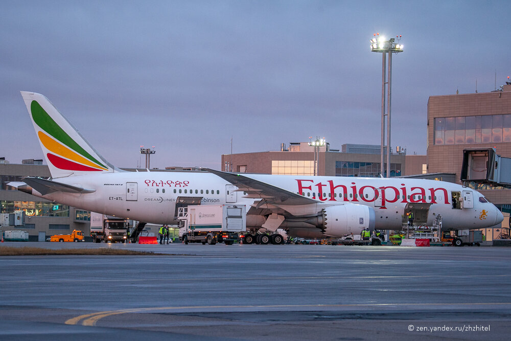 Как ни крути, но большинство пассажирских авиаперевозок в мире выполняются на самолетах двух производителей: Airbus и Boeing. Обе фирмы предлагают несколько типов и постоянно работают над усовершенствованием техники, модернизируя существующие типы и выпуская новые. Расскажу о самолете, который есть в «Эфиопских авиалиниях», но нет ни у одной российской компании. Это Boeing 787. У этого типа есть красивое собственное имя — Dreamliner, то есть «самолет мечты». Американцы знают толк в маркетинге. Пара слов о самолете в целом. Boeing 787 Dreamliner совершил первый полет в 2009 году, в коммерческой эксплуатации с 2011. Сейчас произведено 894 самолета этого типа. Крейсерская скорость самолета 902 км/ч, максимальная 956 км/ч. Дальность полета в зависимости от модификции от 11910 до 14140 км. Пассажировместимость от 242 до 330 человек в двухклассных модификациях. Особенность Boeing 787 — широкое применение композитных материалов, их доля в фюзеляже — 50%, также здесь используются новый двиг
