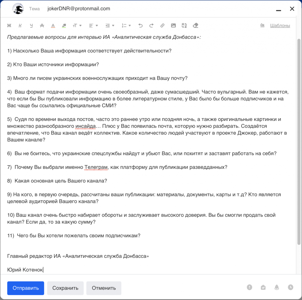 Джокер ответил редакции АСД. Написать Джокеру оказалось очень даже просто — по указанному в его ТГ-канале почтовому адресу. Мы воспользовались такой возможностью и задали вопросы этому странному таинственному персонажу, который выкладывает в свободный доступ массу документов украинских политиков и военных. Мы надеемся на ответ, ведь, честное слово, Джокер заинтриговал нас. Львиная доля его секретных материалов — с грифом «секретно» или ДСП, но это не является препятствием для вездесущих шпионов Джокера. Он уверяет, что его люди есть повсюду, и только осознание этого уже наводит панику на военных и сотрудников спецслужб Киева, делает посмешище из украинских политиков и ораторов из «суспильства». Аналитической службе Донбасса, прежде всего, интересно, что чем игрок видит смысл своей неутомимой деятельности? Итак, - Насколько Ваша информация соответствует действительности? - На 100%.