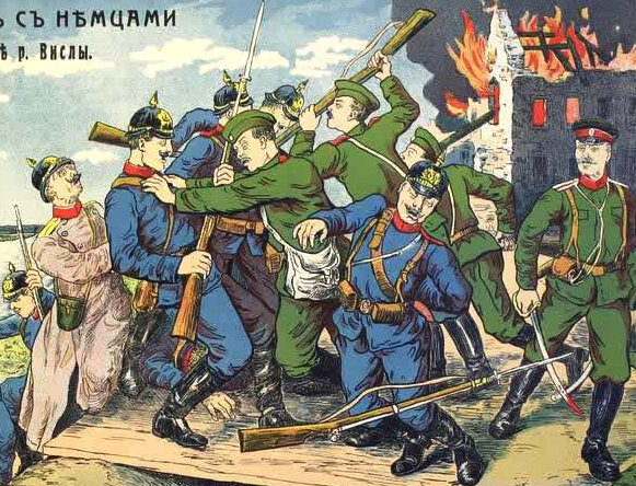 О рукопашных схватках между сибиряками и немцами из воспоминаний об участии в Первой мировой войне казачьего офицера И. Саянского. Описываемые события относятся к противостоянию с немецкой армией за "узкий перешеек" реки Бобра в Польше. О немцах в бою и недостатках их штыков Саянский писал о немецких солдатах "здоровенных и длинных прусаках": "Они дерутся зверьми, но ... не в одиночку! И часто идут в атаку в дребезг пьяные ..." Казак был не высокого мнения о немецких штыках-тесаках и наносимых ими в бою рубящих ударах: "наш маленький коренастый и скуластый (сибиряк - Авт.) ... угрем проскальзывал под сверкающим кругом этого тесака и ловким, хладнокровным взмахом вгонял свой четырехгранный штык - стилет в незащищенную грудь немца. Так же коротко выдергивал и, оставив обалдевшее, падающее тело, кидался к другому, ловким взмахом приклада отбивая удар сбоку" Немецкий штык-тесак мешал при стрельбе и солдаты снимали его находясь в окопах, а при атаке снова надевали на винтовку. Русские