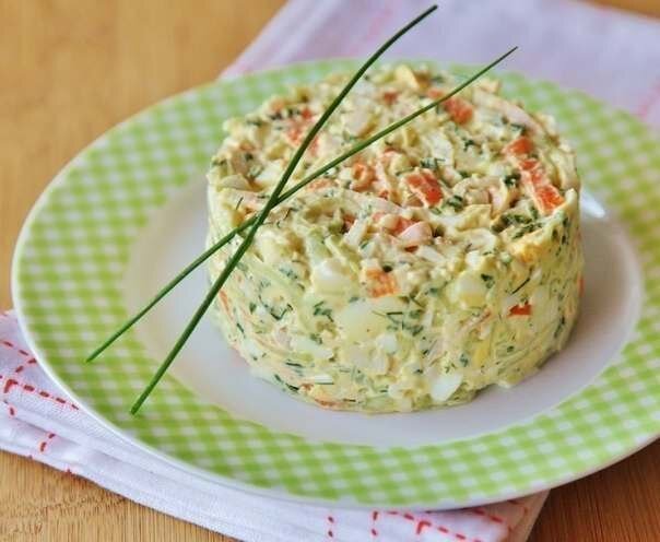 Море волнуется: раз! Ингредиенты: Крабовые палочки - 200 г. Огурец - 1 шт. Яйцо куриное варёное - 4 шт. Укроп - 1/2 пуч. Лук зелёный - 1/2 пуч. Майонез - по вкусу Соль - по вкусу Приготовление: Крабовые палочки нарезаем небольшими кусочками. Огурец очищаем от кожицы и натираем на крупной тёрке. Рубим варёные яйца. Смешиваем все подготовленные ингредиенты в глубокой миске (от огурца необходимо предварительно отжать лишний сок). Добавляем нарубленный зелёный лук и укроп. Солим по вкусу и заправляем майонезом. Готовый салат выкладываем на тарелку, утрамбовав его в металлическое кольцо. Аккуратно снимаем кольцо и подаём салат к столу, украсив стрелками зелёного лука Приятного аппетита вам