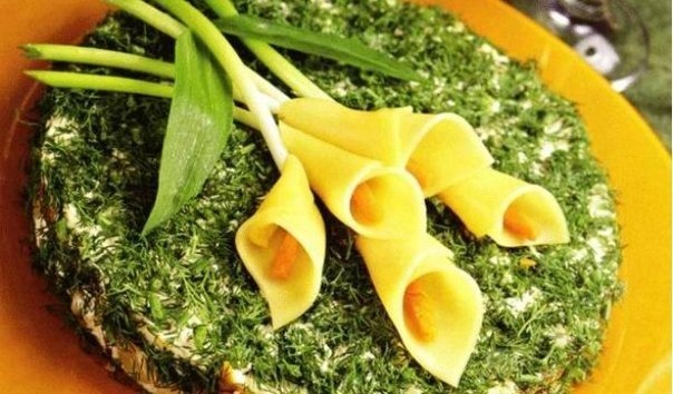 Филе порезать на мелкие кусочки. Грибы обжарить. Сыр, морковь и яйца потереть на терке. Салат выкладывать слоями, каждый перемазывать майонезом (грибы-куриное филе-ананасы-сыр-морковь-желток-белок). Сверху блюдо украсить каллами - пластинками плавленного сыра, свернутого " кулечком" с ломтиками моркови внутри. Их зеленого лука сделать стебли цветов, украсить укропом.