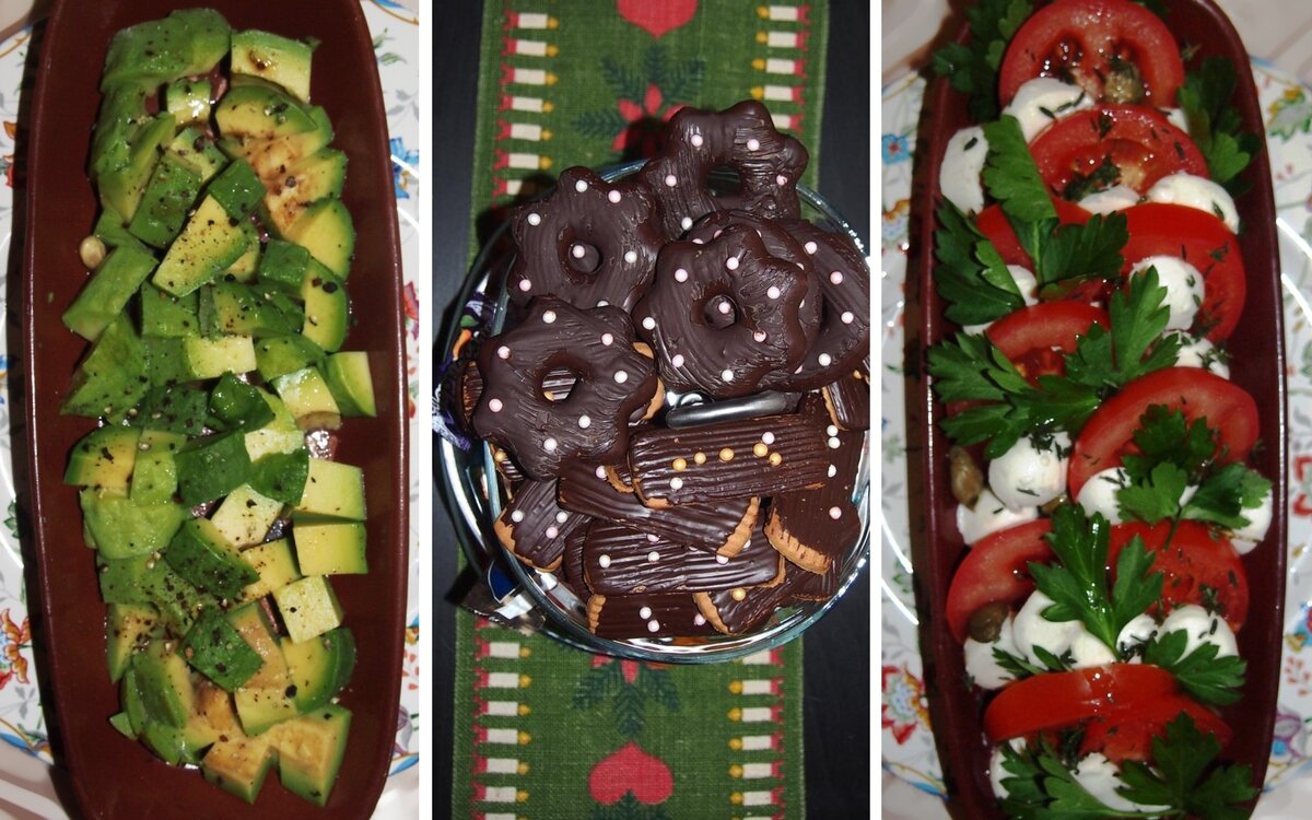 Как я писала чуть ранее, у меня был самый настоящий аврал перед Новым годом. В связи с чем, праздничным столом я занялась буквально 31-го. Продукты быстренько купила вечером 30-го в Пятёрочке. Ибо она в шаговой доступности. Описываю десерт, и пару салатиков, на которые затратила пол-часа. Время в скобках. Сначала про сладости (15 минут) Делала днём 31-го. Имбирное печенье в шоколаде Хотелось чего-нибудь имбирного. В магазине нашлись печеньки. Да, имбирные. Но - рассыпчатые, песочные. Хотя, тоже не плохо. Ещё купила посыпушки - шарики ( по акции три пачки на 80 рублей). В общем, растопила шоколад (как в апельсиновом десерте, ссылка будет внизу). Покрасила печеньица и прилепила горошинки. Всё! Глазурь использовать не стала сознательно. Она слишком сладкая (голый сахар же!). Прянички Там же, рядом с печеньем лежали симпатичные пряники.Уже облитые шоколадом. Тоже взяла коробочку. Знаю точно, что они вкусные, хоть и не имбирные )))) В общем, прянички тоже попали под раздачу. Смазала