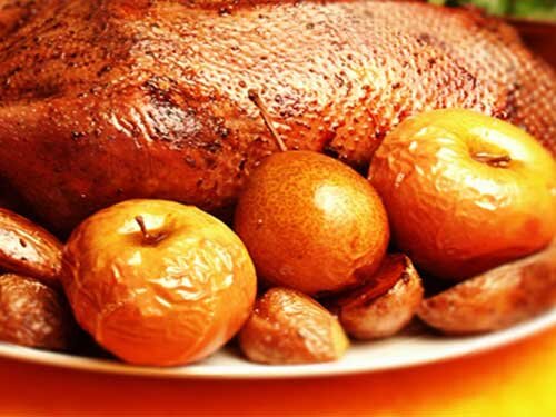 География блюда: Россия, Украина, Германия, Дания, Швеция На праздничных столах жителей многих европейских стран приоритетными являются именно сложные, но фантастические блюда из гусиного мяса, которое отличается меньшим количеством жира, по сравнению с уткой, например, а также отлично сочетается с кисло-сладкими ингредиентами. На кануне любимого всеми торжества мы хотим поделиться рецептом блюда, название которого – рождественский гусь с яблоками. Для этого нам понадобится средний трехкилограммовый гусь, килограмм твердых яблок, желательно кисловатых, много приправ, рукав для запекания, шпажки – и рождественская сказочная атмосфера с приятным пряным запахом буде вам обеспечена. Что ж, начинаем приготовление. Ингредиенты Дополнительные материалы Порядок приготовления блюда (обработка гуся) Подготовка ингредиентов для начинки Фаршировка птицы Процесс запекания Подача Заметки