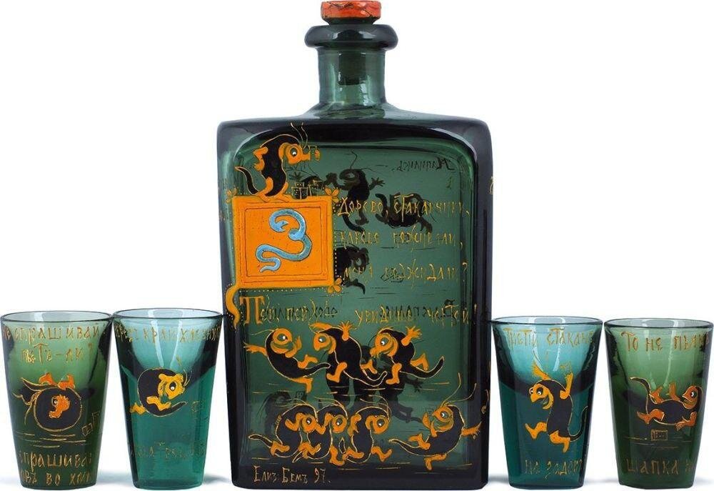 Набор для водки - штоф и 4 стопки по эскизам Бём Елизаветы Меркурьевны (1843—1914). Россия, Дятьковский хрустальный завод. 1897. На штофе подпись автора и дата: « Елиз. Бём. 97 ». Надписи в декоре: « Здорово стаканчики, каково поживали, меня поджидали? », « Пей, пей – увидишь чертей! », « Напились, – подрались! Выспались, опохмелились и помирились ». Русская художница и иллюстратор, рисовальщица, силуэтист Елизавета Бём обучалась в рисовальной школе Общества поощрения художников в СПБ, окончив её с серебряной медалью. Работала, как иллюстратор русской классики. В 1890-х годов начинается новый период творчества. С этого времени, не бросая занятий акварелью, она начинает работать в новой для себя отрасли — создание эскизов для производства стеклянной посуды. Предметы из стекла, созданные по рисункам Е.М. Бём, принесли ей успех практически сразу после их создания — на Всемирной выставке в Чикаго в 1890 году, а затем на Всероссийской выставке в Нижнем Новгороде 1896 году. Весь 1899 год б