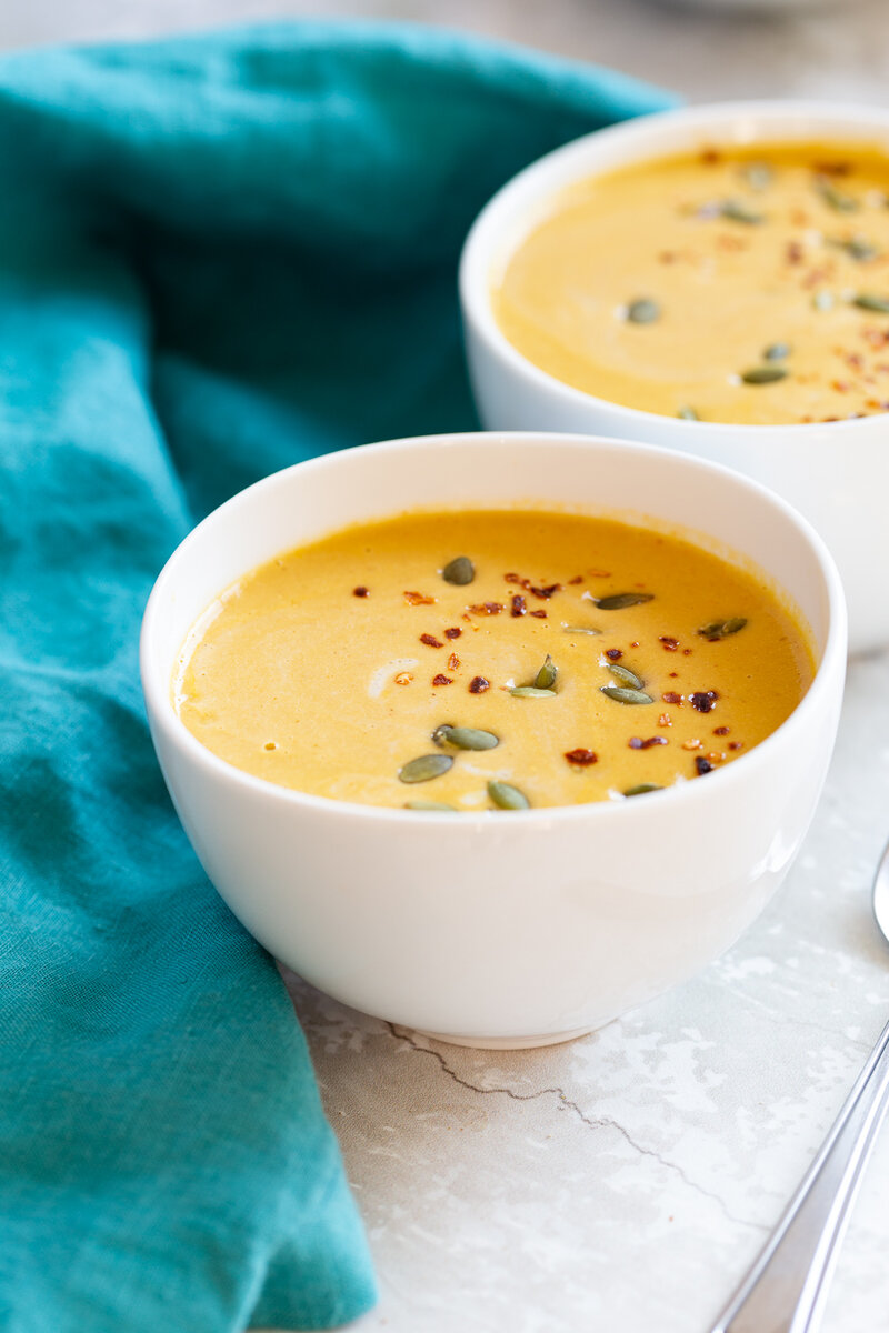 Когда на улице сыро и холодно, нет ничего лучше этого супа. Сливочный, пикантный, пряный и горячий он согревает тело и душу. Также этот суп можно приготовить, охладить и заморозить, чтобы съесть потом. Ингредиенты: 1 ч. л. масла или используйте 2 ст. л. овощного бульона для обжарки 1/2 стакана (80 г) мелко нарезанного лука 2 зубчика чеснока мелко нарезать 3 см корня имбиря, мелко нарезанного 1 зелёный перец чили, мелко нарезанный (или используйте 1 столовую ложку мелко нарезанного болгарского перца) 1/2 ч. л. сушёного тимьяна 1/4 ч. л. кайенского перца 4 стакана (650г) тыквенного пюре, (консервированная тыква) или пюре из варёной тыквы 1 яблоко 1 ч. л. соевого соуса (по желанию) 1/4 стакана (32.25 г) кешью или используйте 1/2 стакана кокосовых сливок или 1/2 стакана варёной или консервированной белой фасоли 2 стакана (473,18 мл) овощного бульона или воды 1/2 ч. л. соли Порядок приготовления: В глубокую кастрюлю налейте растительное масло, добавьте лук, чеснок, имбирь, чили и щепотку