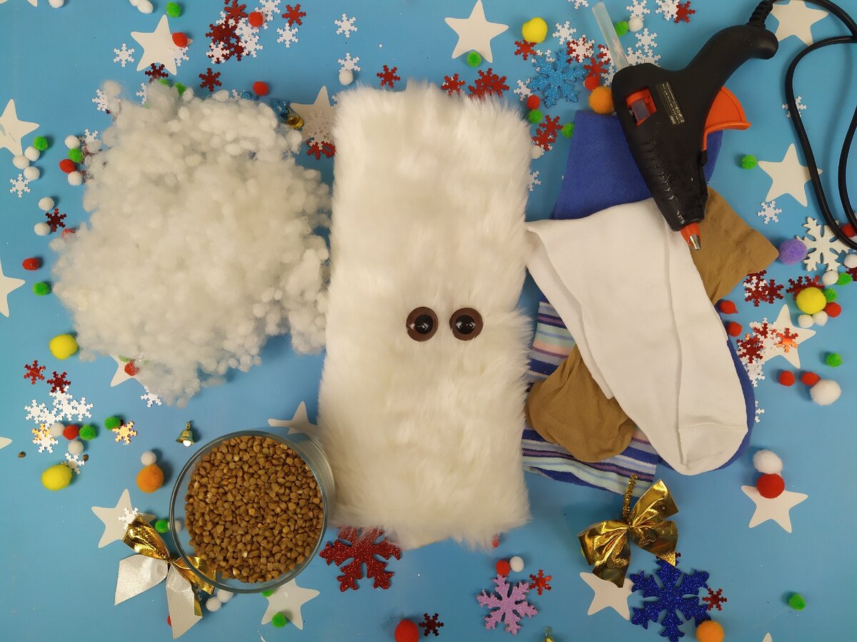 Мы вам покажем очень простой, легкий и быстрый способ как сделать гномика из носка. Эта чудесная игрушка очень понравится детям и будет хранителем уюта в их комнате. Итак, для работы нам понадобятся следующие материалы: Для начала синий носок разрежем следующим образом: Так как он был длинный, то среднюю часть мы нигде не использовали, нижнюю взяли для тельца, а верхнюю (полосатую) для кофточки. Берем нижнюю часть - сам носочек - и наполняем его почти доверху гречкой. Завязываем сверху ниткой и максимально обрезаем все лишнее Теперь формируем руками тельце и голову. Это очень просто, гречка в носке будет держать форму. Теперь берем полосатую часть носка и надеваем на тельце будущего гномика Теперь из белого носочка будем делать колпачок. Для этого разрезаем его так, как показано на следующей фотографии Выворачиваем носок на другую сторону и обрезанную часть проклеиваем клеем пистолетом. При желании можно и сшить, но склеить проще. Затем выворачиваем заготовку обратно и наполняем холлоф