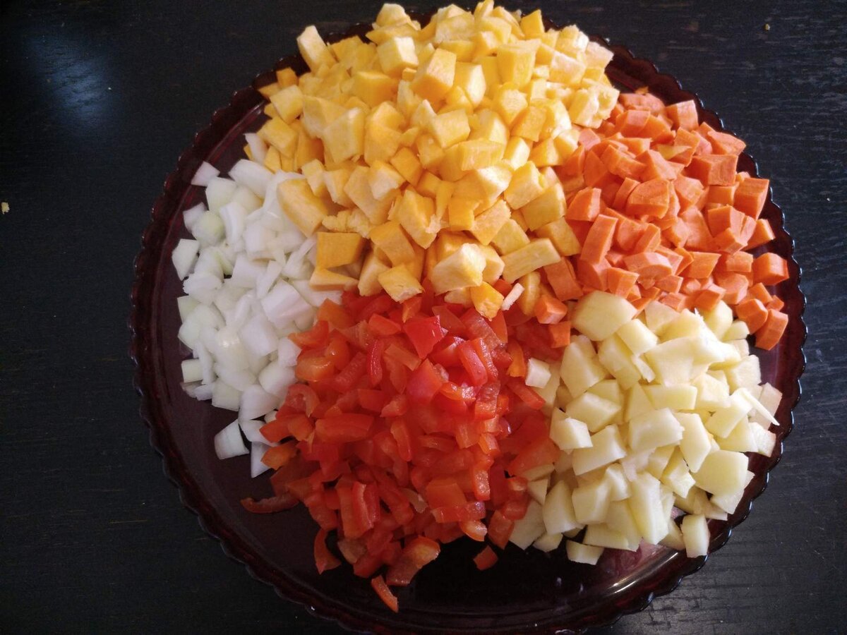 1. Лук, морковь, картофель и тыкву режем квадратиками. Перец дольками. Кусочки овощей не дол