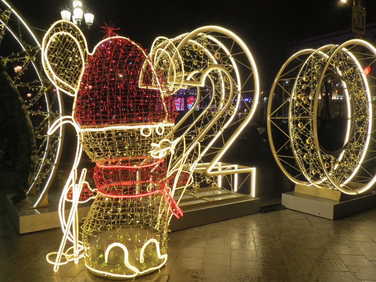 Вот и наступил Новый 2020 год! Новые надежды, ожидания, мечты! Праздничное новогоднее настроение на улицах города удалось создать несмотря на отсутствие снега в Москве. Очередная дождливая новогодняя ночь не помешала москвичам весело встретить Новый год. Тысячи жителей и гостей столицы отмечали праздник на Тверской, украшенной ёлками, гирляндами и космическими инсталляциями. До трёх часов утра публику развлекали артисты всевозможных жанров: на сценах выступали театральные и музыкальные коллективы, детей веселили аниматоры, а в воздухе работали канатоходцы, проходя над Тверской по натянутым между домами тросам на головокружительной высоте. Шоу на центральной улице Москвы будет продолжаться и в ближайшие праздничные дни. Прогулку по Тверской можно совместить с походом в музей или в театр. Мы по старой традиции каждый год 31 декабря ходим в театр. Не всем же ходить в баню. В этот год выбор пал на театр имени Пушкина на Тверском бульваре. Сам бульвар, как всегда, сказочно украшен. Огромн