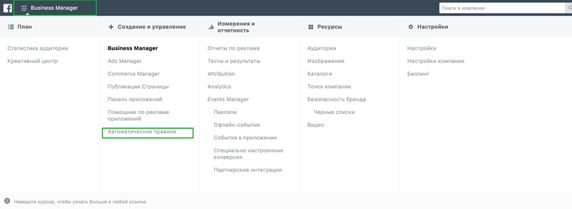 Итак, чтобы создать новое правило, необходимо из меню Ads Manager перейти в раздел “Автоматические правила”: