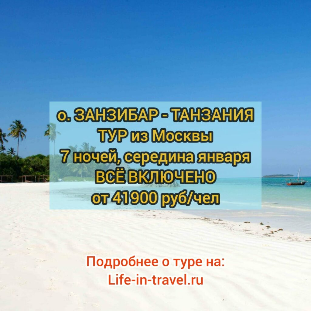 Занзибар Всё включено - тур из Москвы, с проживанием в отеле, перелетом и трансфером, на 7 ночей, всего от 41925 рублей на человека, за весь период проживания. Вылет в середине января - после Новогодних праздников. Москва — остров Занзибар (Танзания), цена от 41925 рублей на 1 человека, при двухместном размещении, на 7 ночей, ВСЁ ВКЛЮЧЕНО. Цена приведена с учетом применения промокода Травелата на скидку: