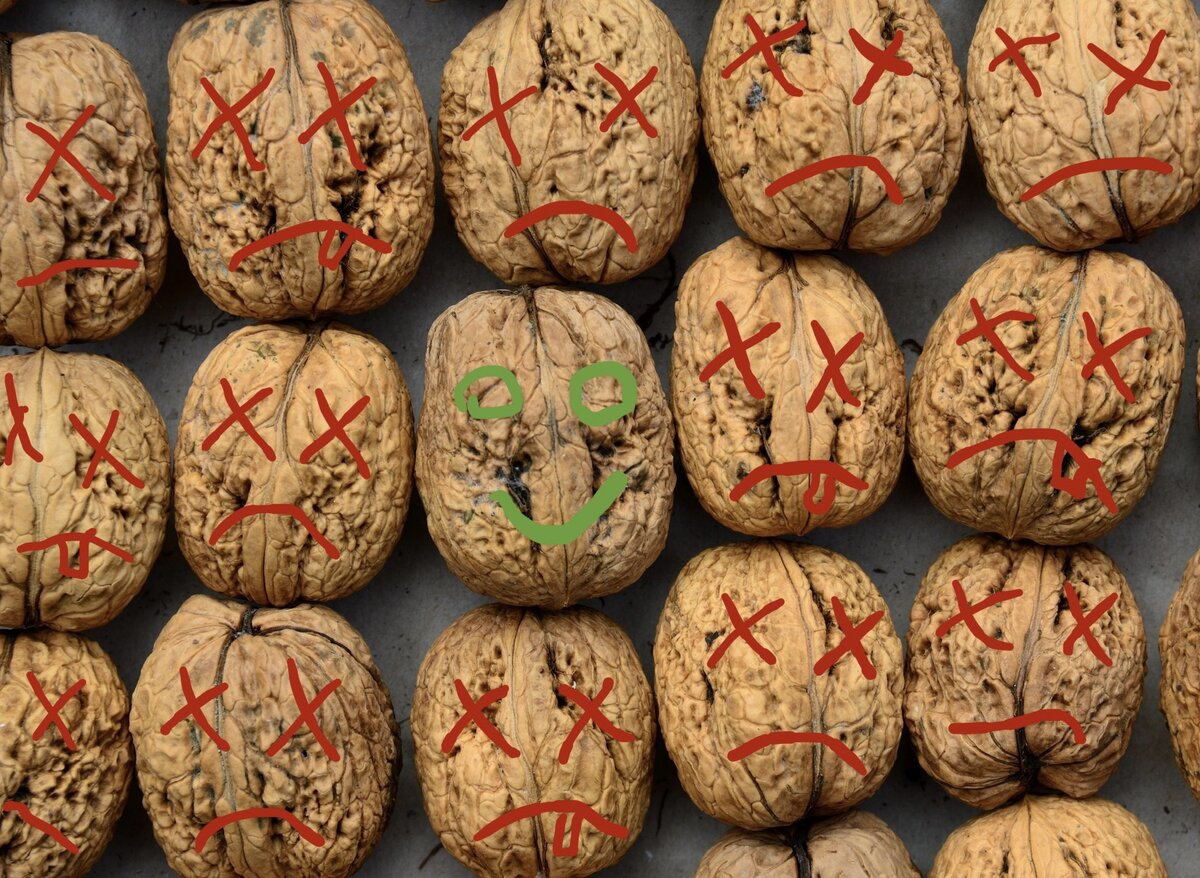 КАК Я ЗАГУБИЛ грецкие ОРЕХИ ПРИ ХРАНЕНИИ. У меня на участке растёт большой грецкий орех. Сезон 2019 года был урожайным, мы собрали около 6 ведер орехов. В связи с тем, что осень была дождливой орехи падали с дерева длительное время, почти до первых морозов, часто на сырую землю, поэтому орехи были грязными. Я их мыл в ведре, ссыпал в ящики для хранения овощей и ставил на просушку в топочную, ближе к отопительному котлу. Орехи хорошо обсыхали, при раскалывании ядра были белые, орехи не плесневели. было решено оставить орехи на зиму в том же месте. Вечерами, мы ножичком раскрывали орехи и лакомились их содержимым. Со временем я стал замечать,что ядро ореха пересохло, почернело и потеряло былой вкус. Вначале пришла мысль о том, что ореху не хватает питательных веществ и ядра из-за большого урожая оказались недоразвитыми, что привело к их усыханию. Я стал искать в интернете и периодической литературе методы подкормки грецкого ореха. Ничего не нашёл. Никто взрослый орех не кормит!. Позже