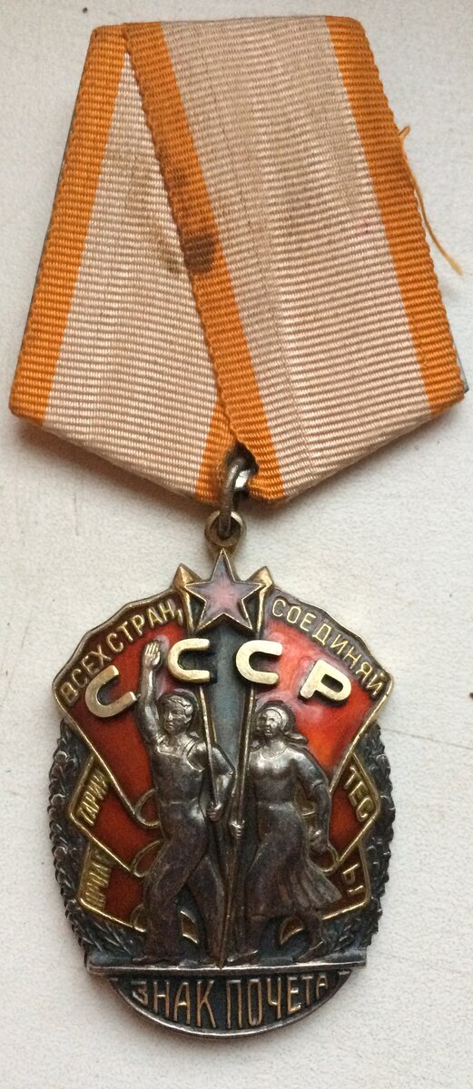 Орден "Знак Почета" учрежден Постановлением ЦИК СССР от 25 ноября 1935 года для награждения за высокие достижения в производстве, научно-исследовательской, государственной, социально-культурной, спортивной и иной общественно полезной деятельности, а также за проявления гражданской доблести. Это один из самых распространенных трудовых орденов. Орден “Знак Почета” изготавливается из серебра, высота ордена - 46 мм, ширина - 32,5 мм. Серебряного содержания в ордене - 29,767±1.388 г (на 18 сентября 1975 года). Общий вес ордена - 32,85±1,75 г. Первые ордена были винтовые и пользуются спросом у коллекционеров. К началу 1941 года орденом было награждено более 14500 человек. Орденом награждали и детей за успехи в труде и учебе. На фото изображен переходной тип ордена "Знак Почета". Он пока еще изготавливается, так же как и его винтовой предшественник из двух деталей, с помощью клепок, но еще не цельноштампованный, как его последующие разновидности. Выпускался этот тип с 1943 по 1955 года. Тир